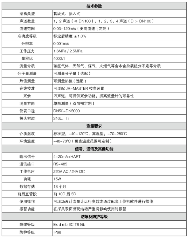 JR-B火炬氣超聲波流量計是利用時差法原理,根 據國家標準GB/T-18604-2014和檢定規程JJR-1030- 2007設計和制造,同時參考了美國AGA8/AGA9/AGA10 報告,各項性能指標達到氣體計量的國際先進水平。該產 品能有效解決組分變化、濕度變化環境下氣體體積精確計 量的難題,滿足了高流速低流速并存,寬量程要求的計量 要求,專有技術開發的分子量計量方法,可有效計算碳氫 化合物的分子量,是一種性能優異的新型流量計量儀表。